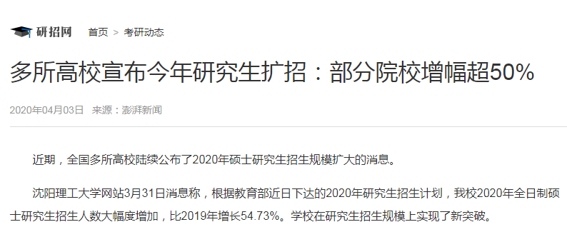 就在这样不景气的阶段里,研招网发布了研究生扩招近50%的消息打破了大学生和在职人员的焦虑,让很多迷茫的看到了机会。