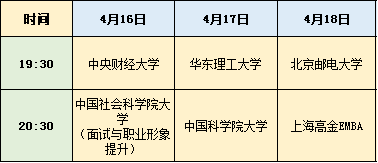 学习时间:4月16日19:30起 每天在线直播介绍2021年的招生政策、面试要求、学费、学校优势、课程特色等。(其他院校的课程表会陆续更新,请关注本公众号方便查看)