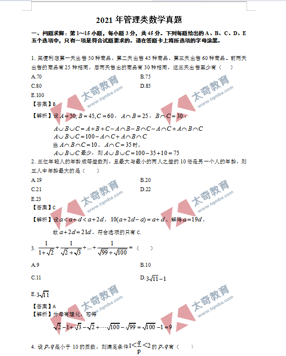 管理类硕士官方备考群,考生互动,择校评估,真题讨论 点击加入备考群>>太奇教育为广大MBA管理类联考考试整理了2021年管理类联考考试试题及答案,内容整理如下,供参考。