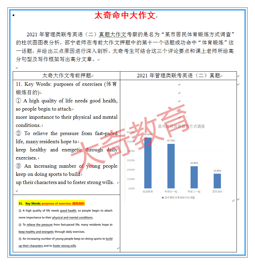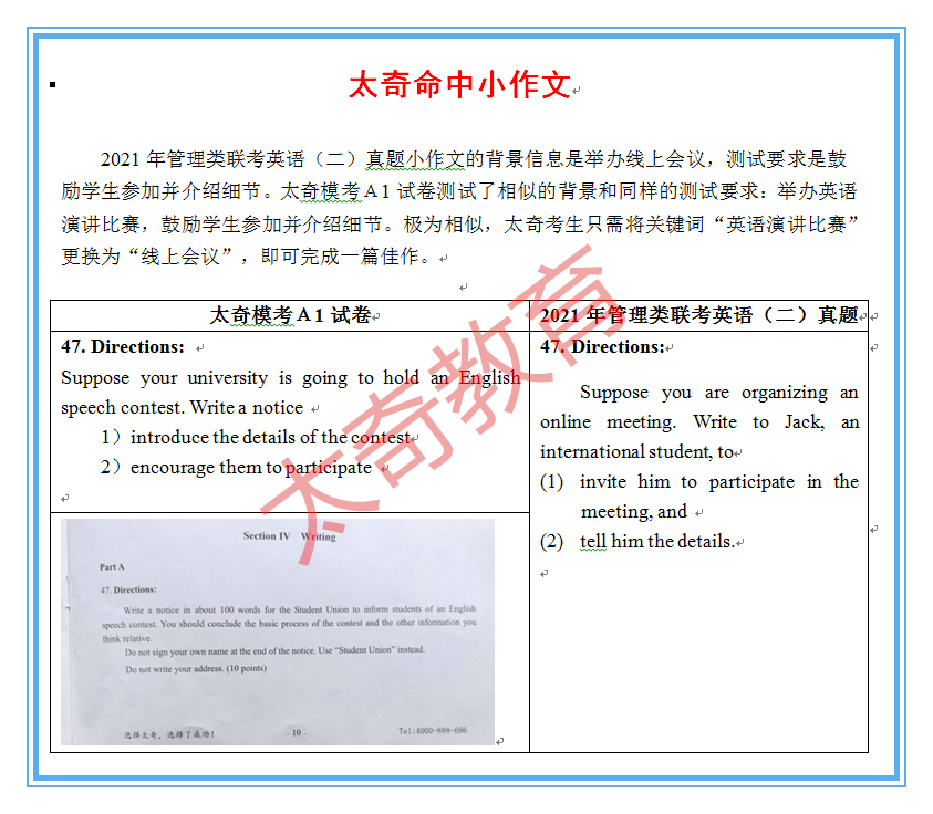 管理类硕士官方备考群,考生互动,择校评估,真题讨论 点击加入备考群>>2021年管理类联考初试我们在考后第一时间拿到了所有科目真题,今年太奇教育再次以丰富的管理类联考教辅经验保证了高命中率水准~!喜贺太奇教育管综+英语大作文 全部命中,联考数学直接命中63分!考后第一时间收到很多学员“原题命中”“按太奇老师讲的稳了”等等好消息,意料之中,但是依旧喜不自胜,相信大家通过这一年高效科学系统的学习都可以顺利上岸!