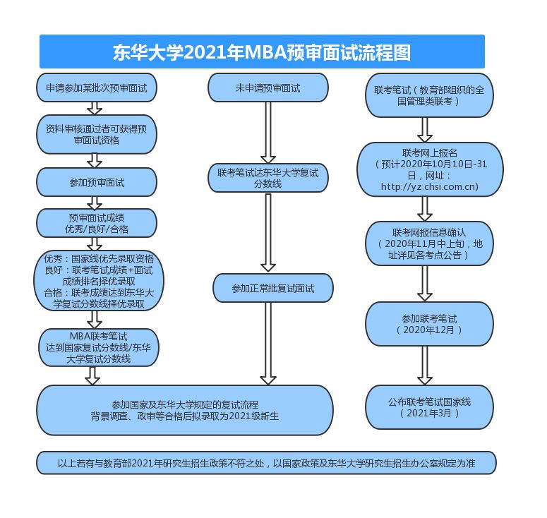 4.未参加预审面试的考生,在全国管理类联考成绩达到东华大学复试分数线后可参加正常批面试,按照联考笔试成绩+面试成绩总分排名,在完成国家和东华大学规定的复试流程后择优录取。