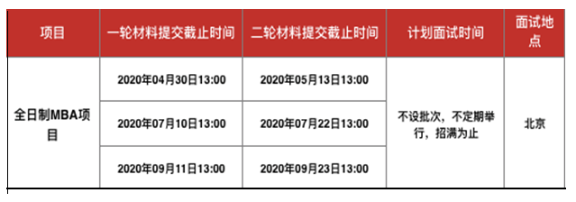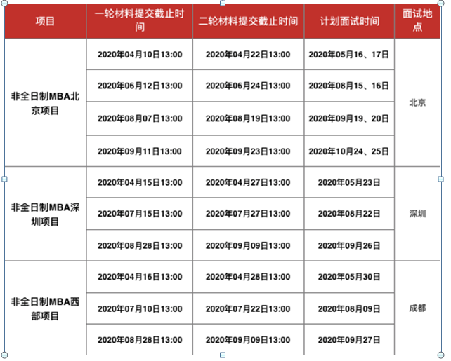 非全日制项目:非全日制MBA北京项目的一轮材料提交deadline为2020年09月11日13:00,二轮材料提交deadline为2020年09月23日13:00;此项目还包括深圳、西部项目招生。