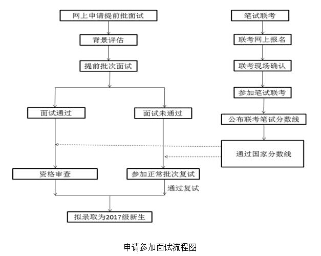 2017年MBA面试工作分为提前批次面试和正常批次复试,考生如通过提前批次面试,笔试成绩达到2017年全国硕士研究生招生考试工商管理硕士考生进入复试的初试成绩基本要求(A类线),即可取得待录取资格,不需要再参加正常批次复试。