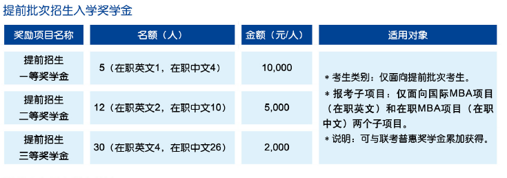“MBA提前批次招生”将安排于2018年5月至11月底结束。对于准备报考各个项目的考生,我们将从全部招生名额中安排较多比例的名额提供给提前批次招生批次的考生,以使优秀的考生能选择更优先的渠道获得录取的机会。