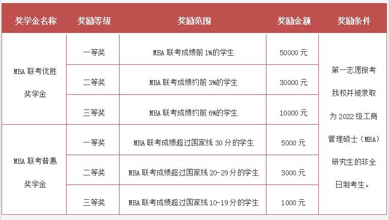 为了鼓励优秀人才攻读非全日制工商管理硕士(MBA),培养更多品学兼优的商界精英,北京交通大学MBA教育中心特设立MBA联考优胜奖学金、MBA联考普惠奖学金。其奖励范围、奖金额度和奖励对象如表二所示。2022级非全日制MBA新生奖学金评选办法详见后续通知。若有变动,均以具体通知为准。