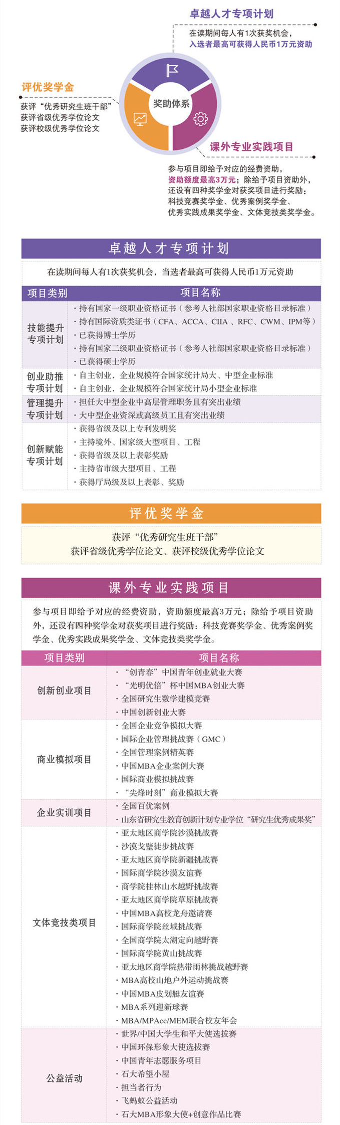完善的“竞、优、才”奖助体系,该体系包括竞技,评优,人才三大类共计54项奖励及资助项目。