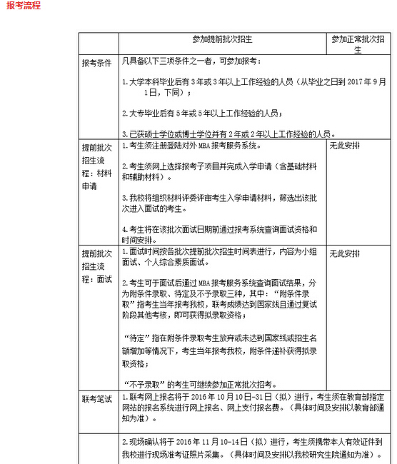 4. “MBA提前批次招生”将安排于2016年5月至11月进行,参加提前批次招生的考生需在联考报名前的指定期间内在线提交申请材料,经过材料评审,择优给予面试资格;经过面试给予综合素质优秀的考生“附条件录取”资格;原则上,该类考生参加全国联考成绩达到国家A线即可录取。