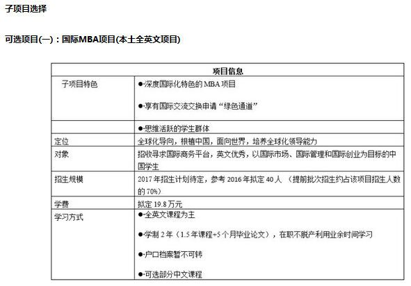 1. 招生类别分为两个子项目:国际MBA项目(本土全英文)、在职MBA项目。两个项目设置独立的招生标准,分别招生,在简历评审、面试选拔等环节各自排序。申请任意子项目并获得附条件录取资格后,原则上不做任何项目调整。