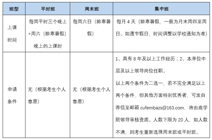 答:非全日制考生在提前批面试阶段选择的班型仅为初步意向。考生可在拟录取结果公示后,即2020年4月中下旬,在中财MBA招生系统中最终确认班型。各班型上课时间及申请条件如下图:
