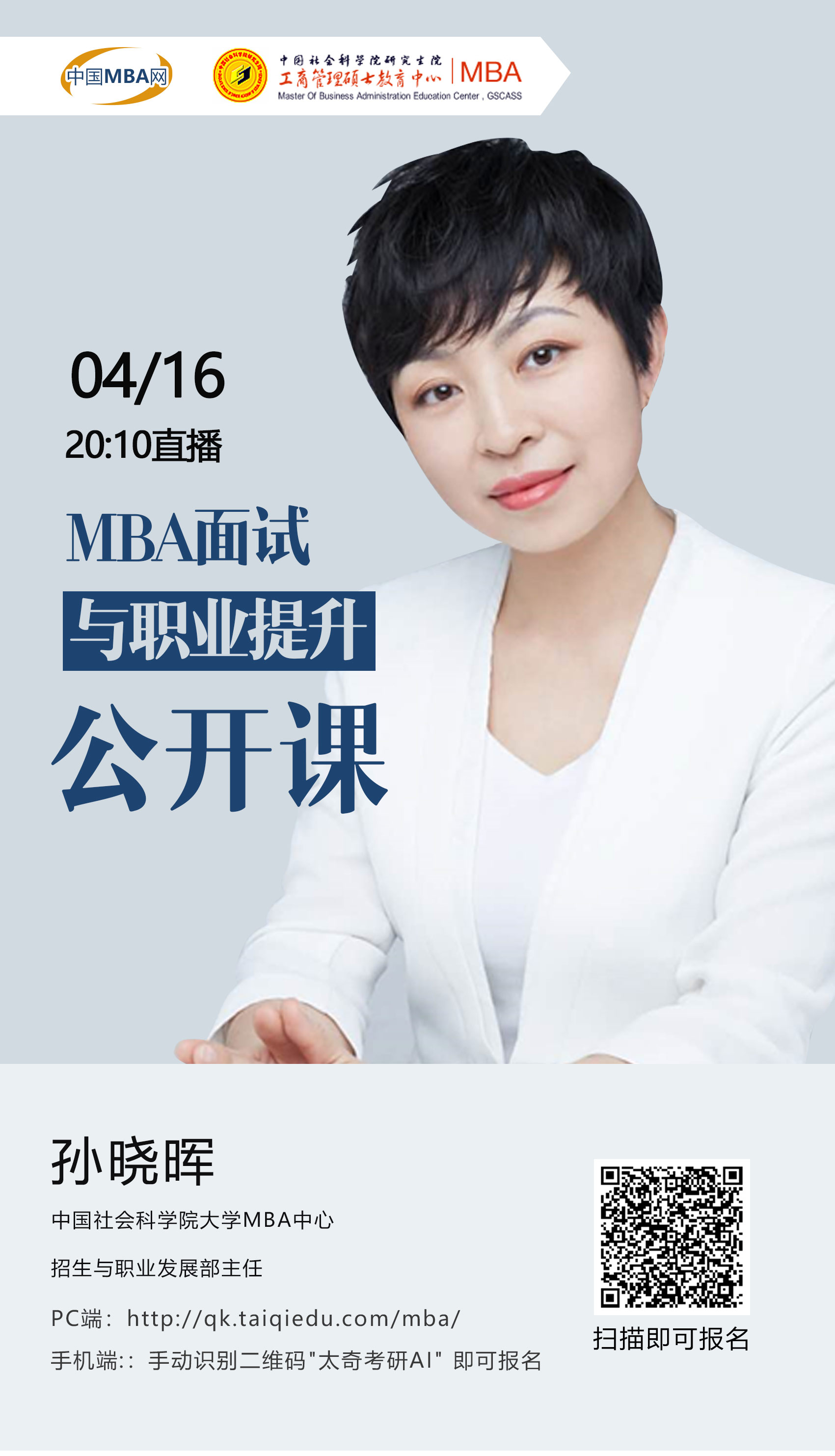 中国社会科学院大学MBA中心招生与职业发展部主任,应太奇教育和中国MBA网的邀请出席“2021全国商学院MBA/EMBA/MEM教育巡展暨招生政策发布会”!为同学们讲解《MBA面试与职业提升》公开课,欢迎广大报考我校的同学积极报名参加,期待与你们线上直播互动。