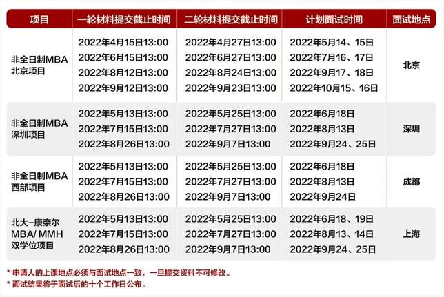 2023年非全日制MBA深圳、西部项目、北大-康奈尔MBA/MMH双学位项目的一轮材料提交最终截止时间为2022年8月26日13:00,二轮材料提交最终截止时间为2022年9月7日13:00。