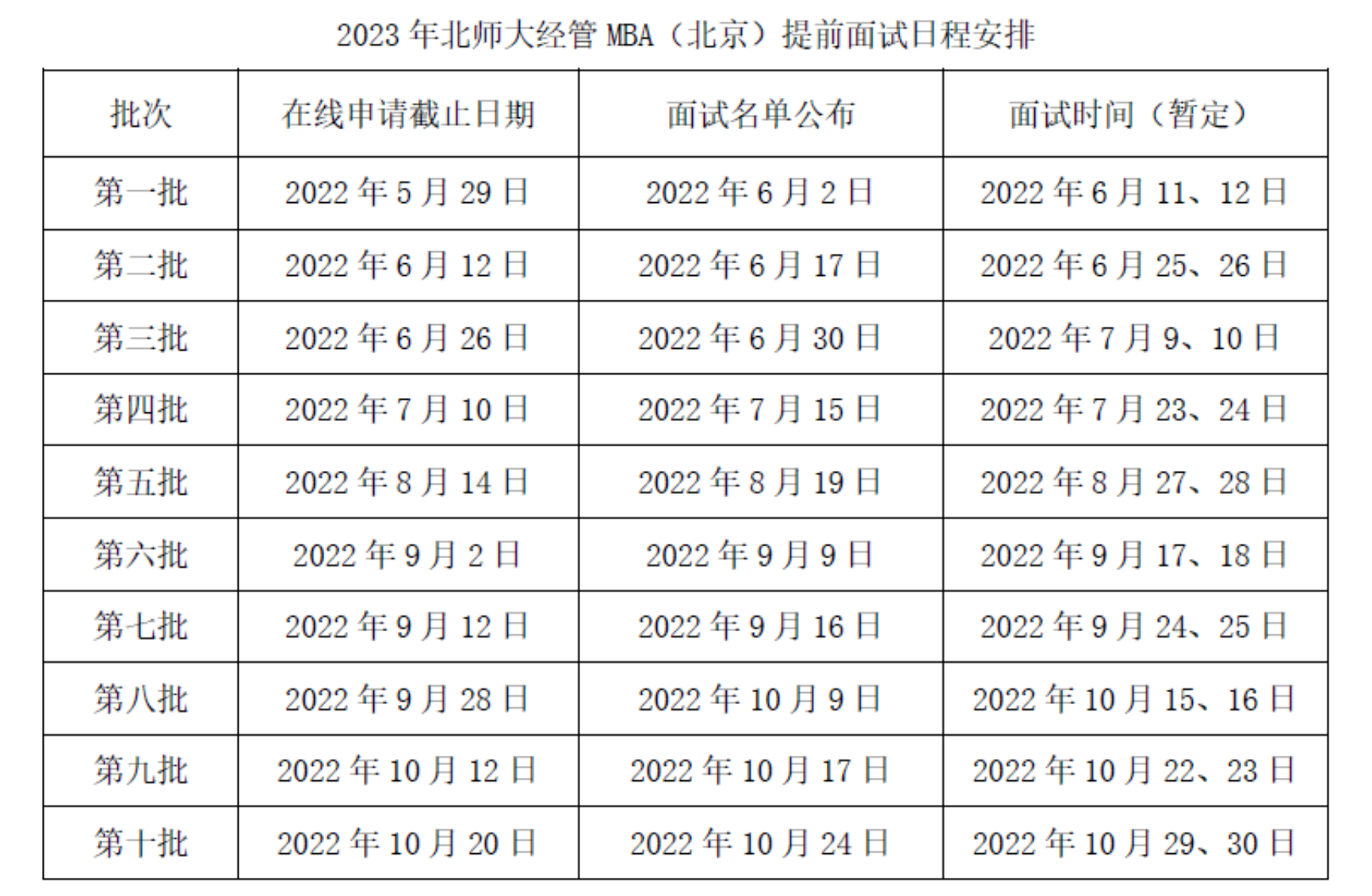 2. 第十批提前面试考生如果获得面试资格,必须在2022年10月25日全国统考报名截止前完成北师大经管MBA(北京)报名,全国统考报名选择北师大经管MBA(北京),否则不能参加第十批面试(其他未获得面试资格、面试不通过,或未申请北师大经管MBA(北京)提前面试的考生,全国统考报名请勿选择北师大经管MBA(北京)。第十批提前面试考生须在正式面试前知悉并签署相应《北京师范大学经济与工商管理学院2023年工商管理硕士(MBA)提前面试风险告知书》。