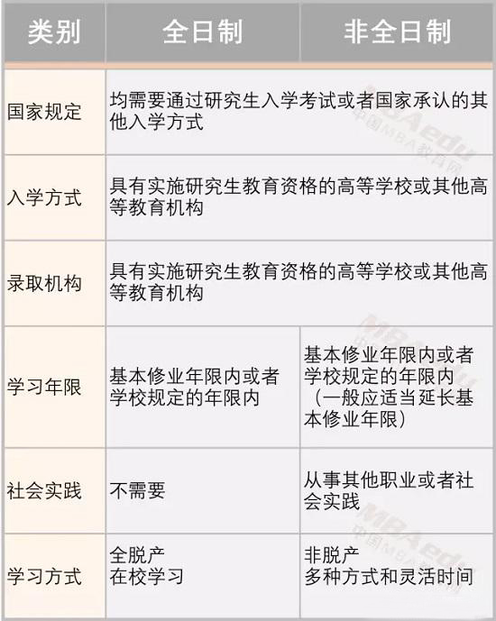 由图表可以看出,《通知》对于全日制和非全日制研究生的区分主要在于是否在职和学习方式两方面,并未涉及学历学位和培养质量。今后MBA研究生将只在培养方式上区分为两类:全日制MBA和非全日制MBA。